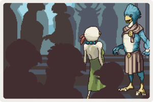 Originally, there were Avian Dungeons that resembled tall towers inhabited by guards. At the top of these towers, there would be two unarmed Avians standing at the edge of the Tower. Speaking to them suggested that they were going to jump off. If the player attacked these Avians, they would thank the player before jumping off the tower. Since NPCs cannot take fall damage, these Avians would not die when hitting the ground. Even earlier in Starbound's development, the Avians appear to be one of the few species to have any alpha lore for them, initially starting with a draft that sounds most similar to their canon lore, and then shifting to rather detailed lore covering the development of their civilization and how they encountered the other species. The largest difference back then was how the Avians worshipped a pantheon of demigods (in fact Avians uplifted by unknown aliens) known as the sunborn, who's leader was named Kluex. |